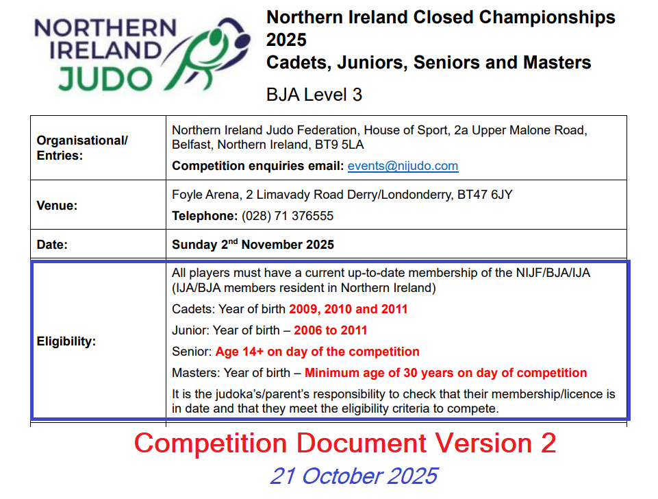 Year of birth – altered and corrected for Cadets & Juniors, 21 October.